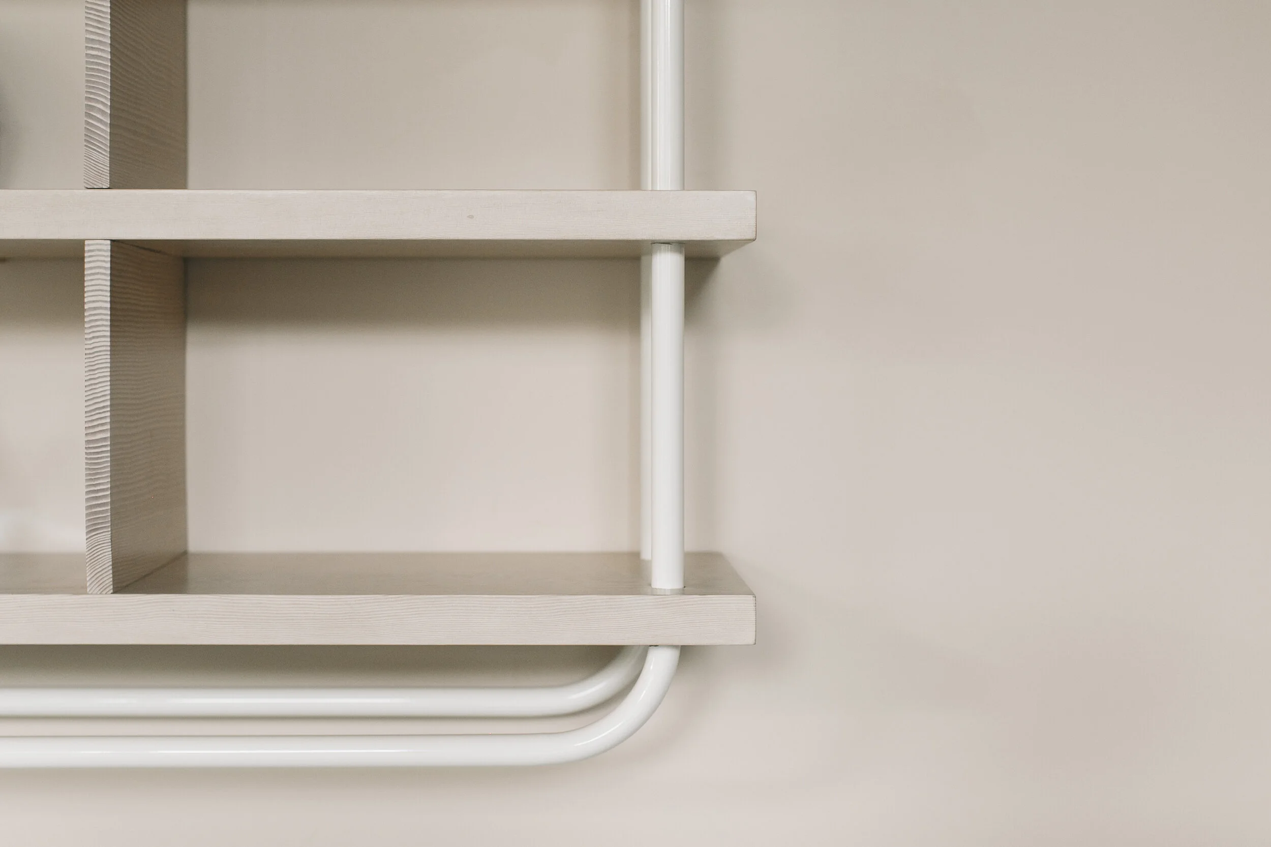 Custom shelving designed with soft curves inspired by Freeland Sprits Gin and Whiskey bottles